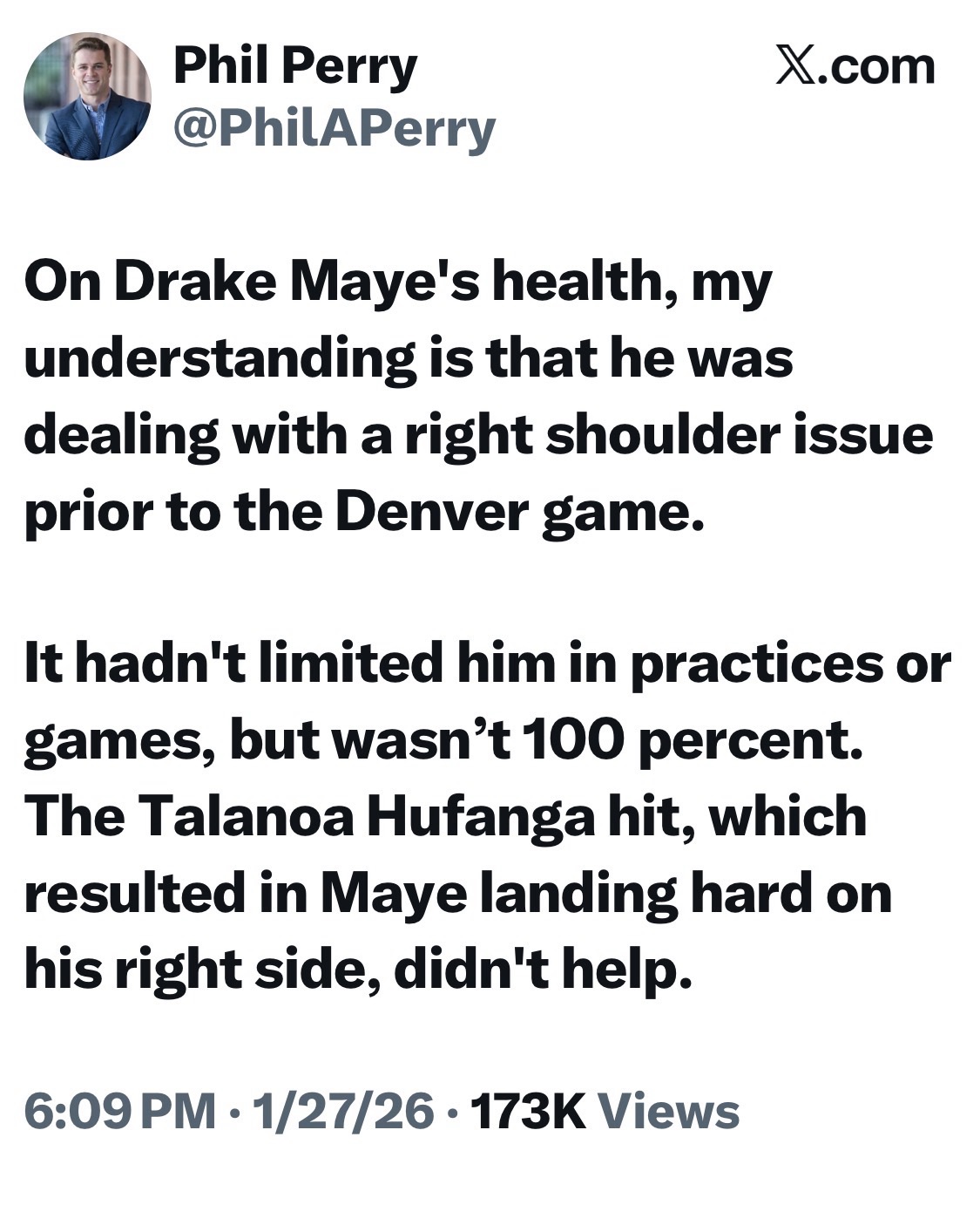 Maye told reporters. Between his ability to “throw a dime” shortly after the hit and the dismissal of the rumors by team insiders like Boston Sports Journal’s Greg Bedard—who reported the shoulder is “not believed to be an issue”—the injury talk appears to be more of a social media creation than a legitimate threat to Maye’s Super Bowl availability.