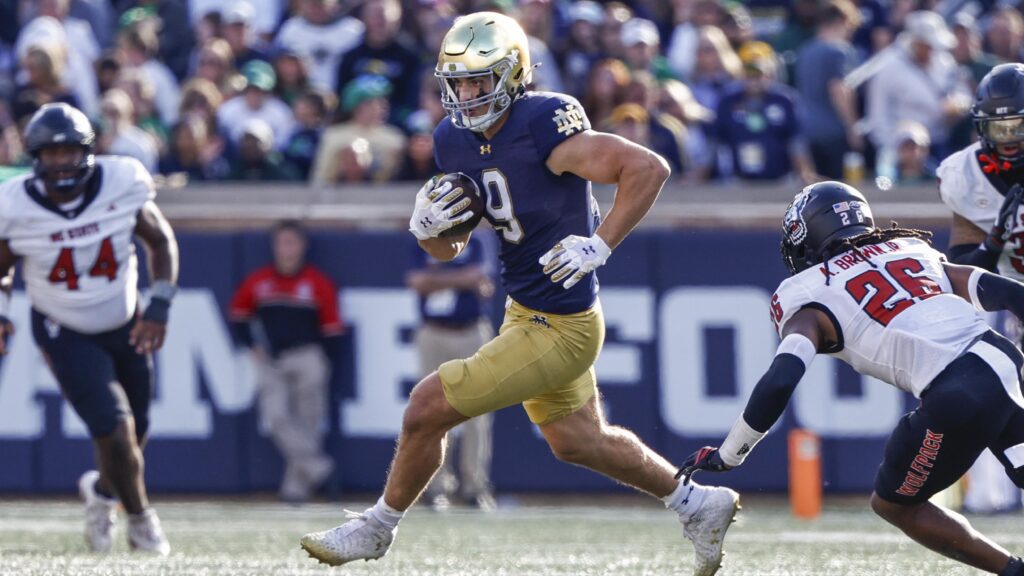Image courtesy of Bleacher Report FOXBOROUGH – The last time the Patriots had a tight end the size of Eli Raridon, it worked out pretty well. The former Notre Dame tight end became the newest Patriot with the 95th overall pick in the third round of the NFL Draft on Friday night. Listed at 6’6,” 245lbs., Raridon could give fans some flashbacks of the old No. 87. Before anyone freaks…