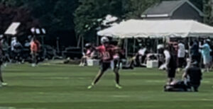 -Maye’s next series: The play of training camp so far. Maye rolled out to his right after getting flushed out and then with a flick of the wrist fired a 50+ yard TD down to Pop, who had gotten behind both Gonzalez and Kyle Dugger, Pop ran through the back of the end zone and high fives a bunch of fans lined up along the back line as the crowd roared. A run stuff, incomplete pass and a short completion to Pop followed, but nothing else in those two minutes mattered.